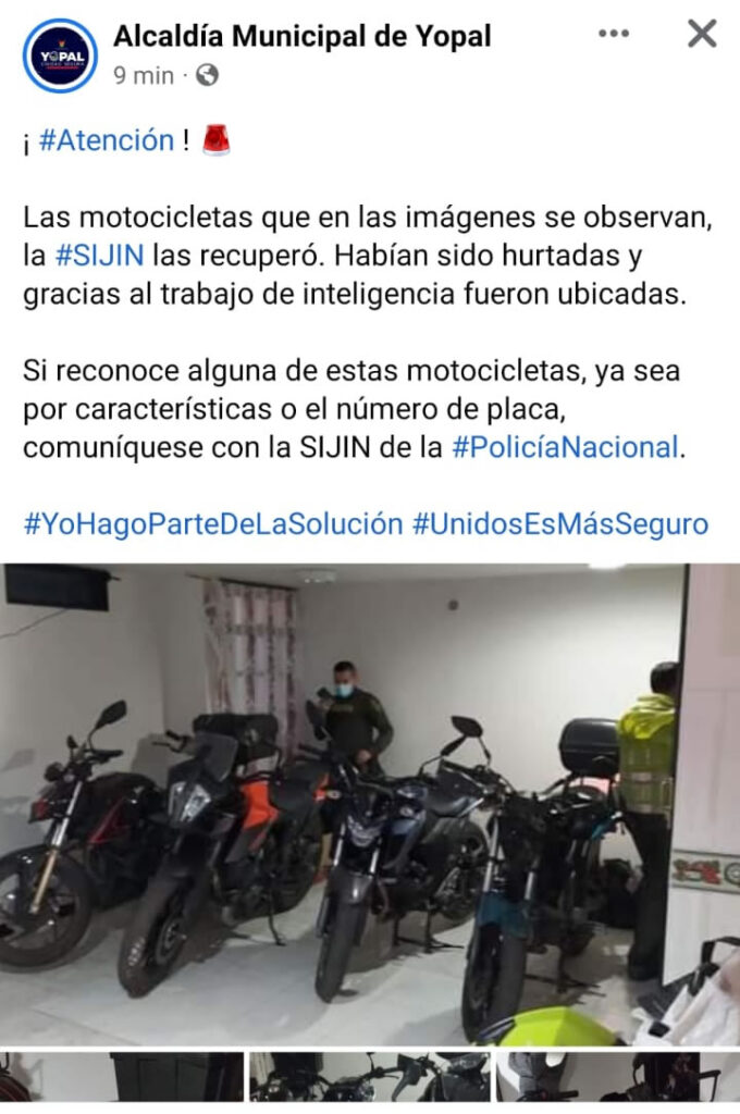 La administración posteo unas fotografías de la recuperación de varias motocicletas por parte de la SIJIN, solicitando que sí, reconoce alguna de las motocicletas se comunique con la institución.